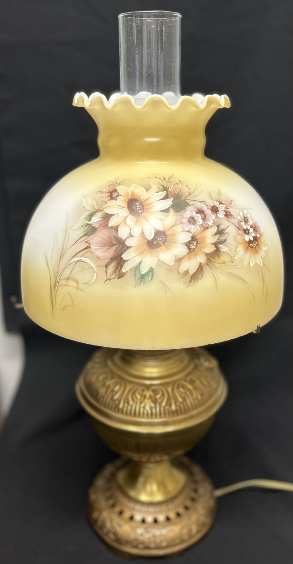 Bradley & Hubbard antique brass oil lamp converted to electric “Rayo” lamp with handpainted lamp shade over glass hurricane shade
