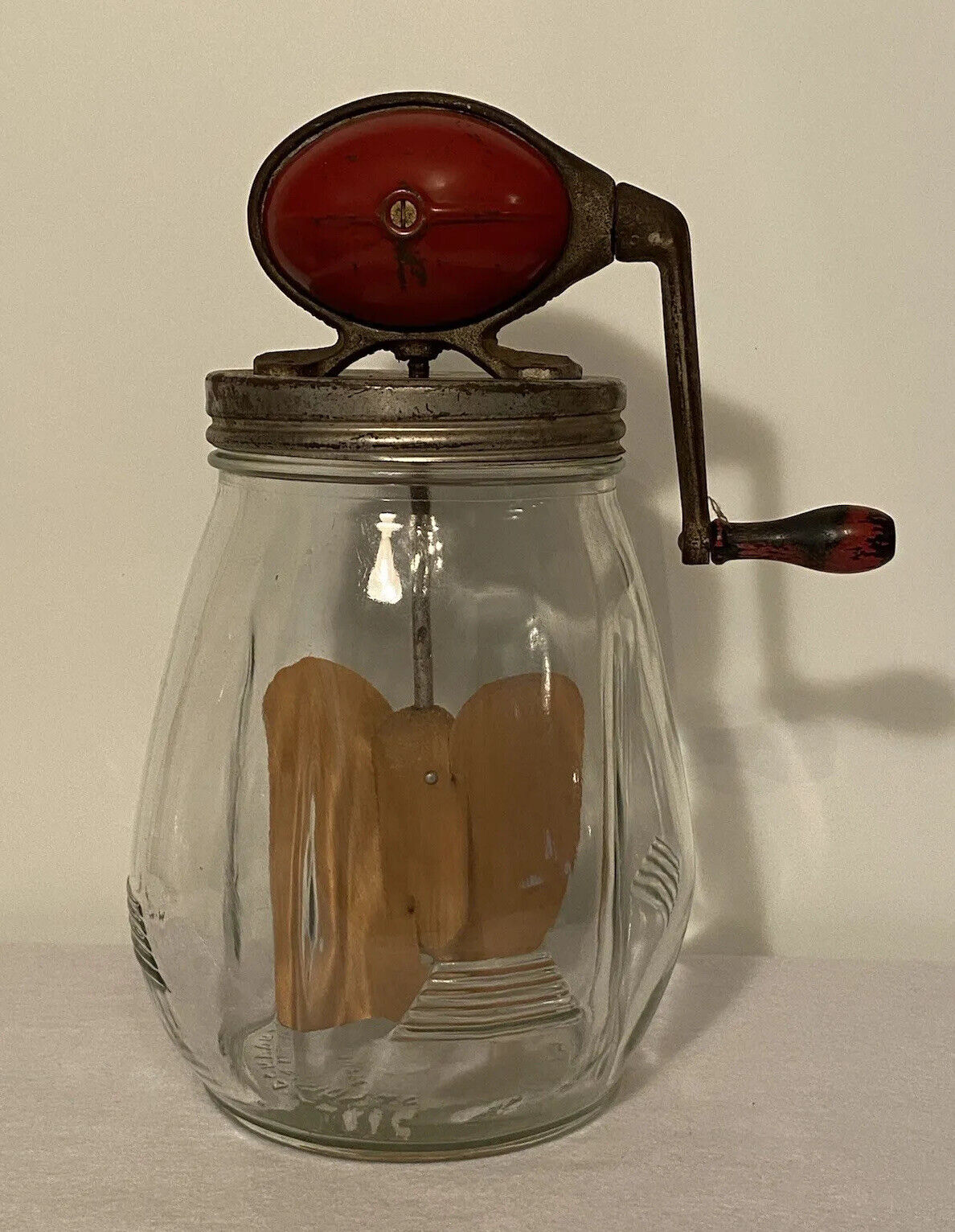 Glass churn jar with aluminum lid trimmed in red wood, with wood churn paddle