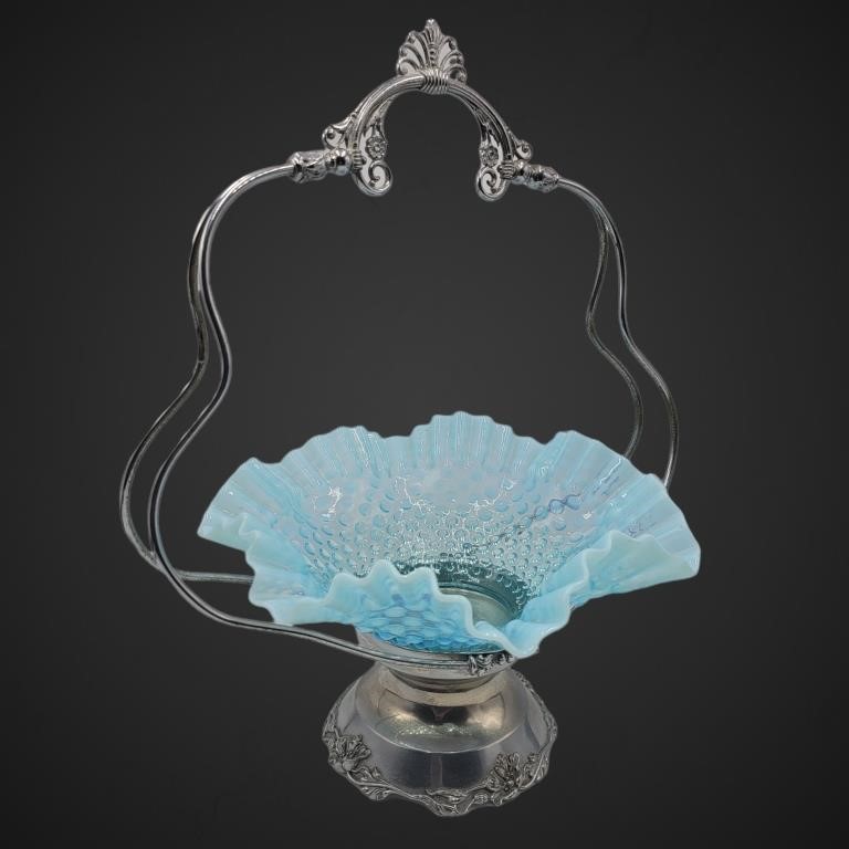 Fenton Hobnail Ruffle Bowl in Poole Silver Co Brides Basket- 9″ opalescent blue ruffle bowl in an electroplated silver stand